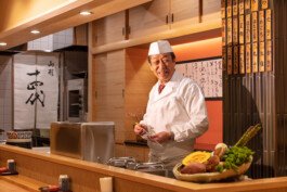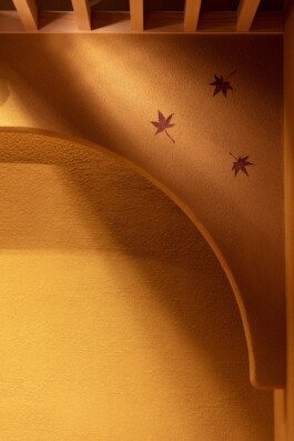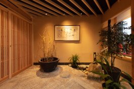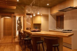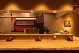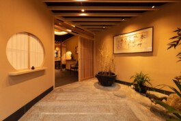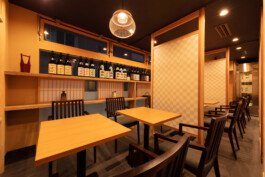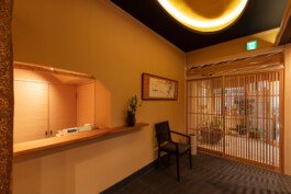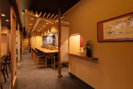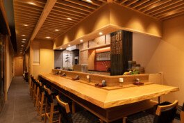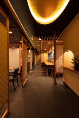 We are particular about solid materials, and we also challenge traditional autumnal walls such as Sugimaru pillars and solid oak counters. The ceiling is oval raised and gold is pasted on the ceiling. From Edo to the Japanese-style room, the image of the eaves roof is made through lattice rafters. At the entrance, there are latticed doors and tsukubai, and the table seats are separated by the number of customers with moving fittings, and there is a calm digging-style private room in the back of the store.